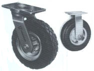 Shock absorbing pneumatic tires for fragile loads, outdoor applications or rough surfaces. Made-in-USA tires are 4-ply rated. Swivels feature drop forged steel mounting plate and horn base with integrally forged kingbolts. Legs welded inside and outside. Roller bearings in all wheels. Mounting plates accept 1/2" bolts. FOB CA, OH